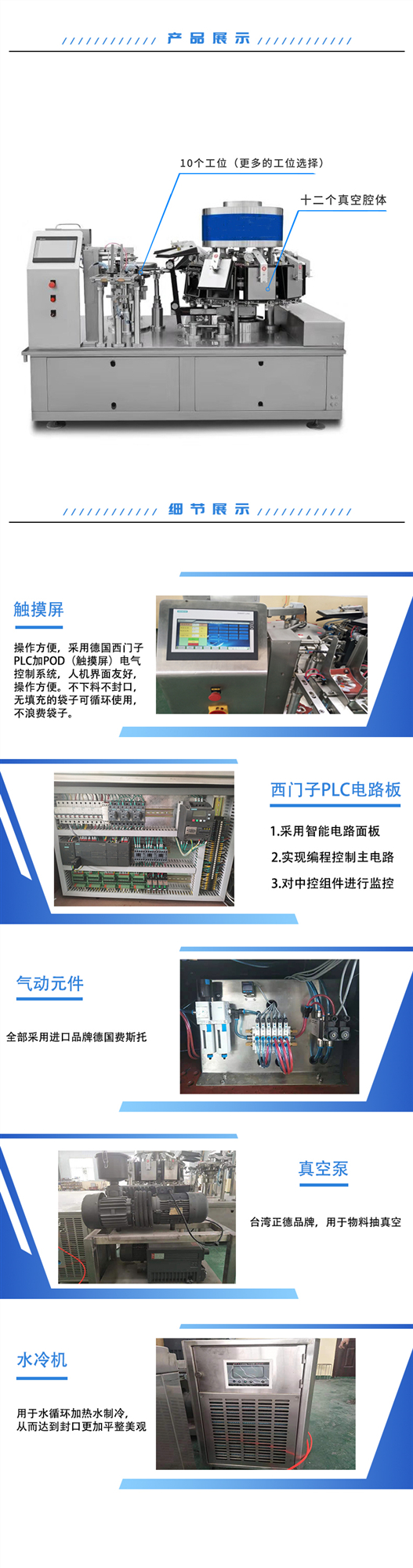 2、旋轉(zhuǎn)式全自動(dòng)真空包裝有兩種分離式的旋轉(zhuǎn)體組成,分為棄填系統(tǒng)和真空系統(tǒng),充填系統(tǒng)為間歇式旋轉(zhuǎn)運(yùn)轉(zhuǎn),真空系統(tǒng)為連續(xù)式旋轉(zhuǎn)運(yùn)動(dòng);